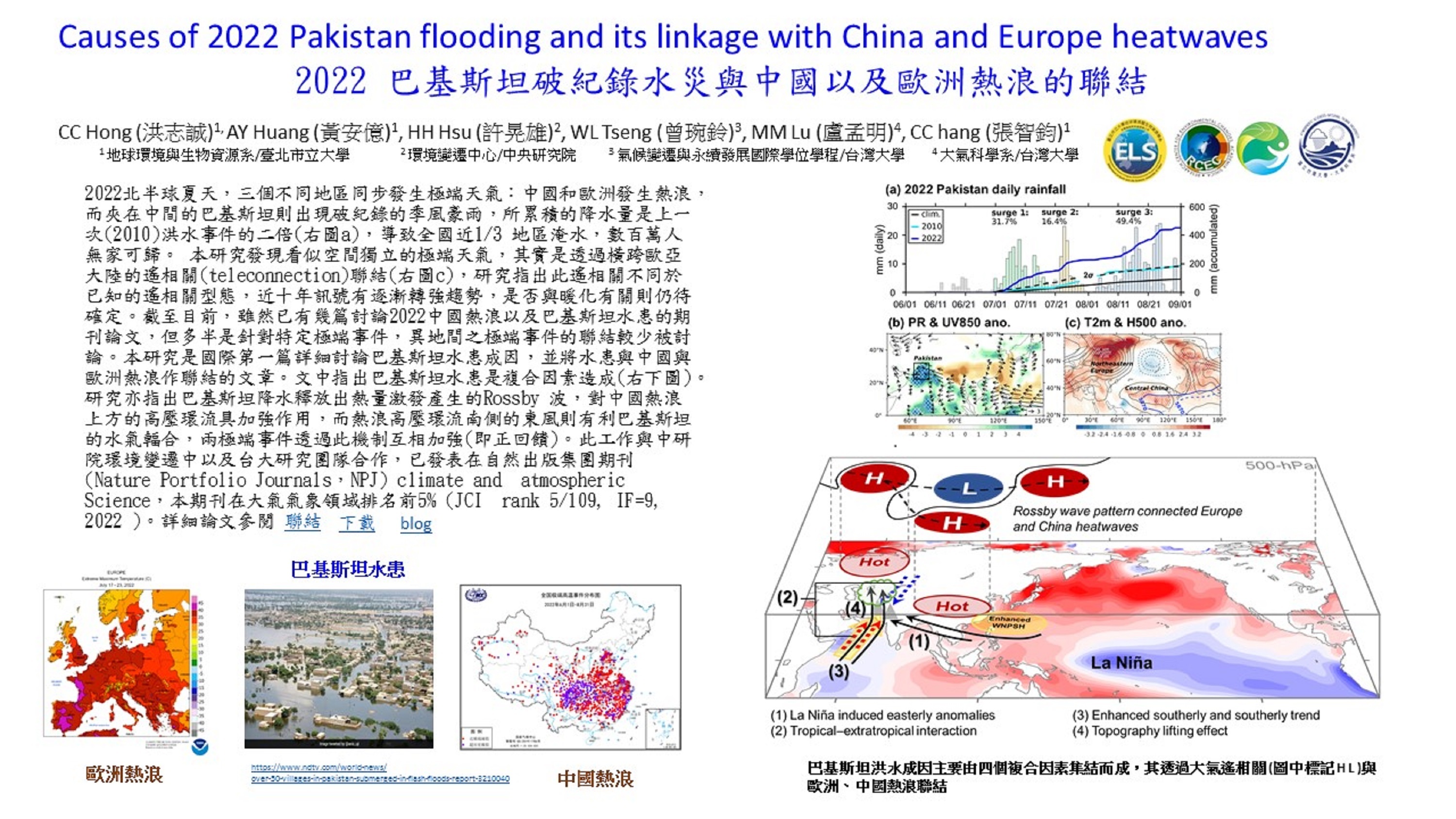 研究專長: 氣象學、全球環境變遷、氣候變遷特論 授課領域: 氣候變遷,季風動力,極端天氣診斷 研究計畫及經歷:洪志誠教師專頁 E-mail:cchong@utaipei.edu.tw 聯絡電話:(02)2311-3040分機4906 研究室:氣候變異研究室 最新研究成果 : 2022 巴基斯坦破紀錄水災與中國以及歐洲熱浪的聯結 |
