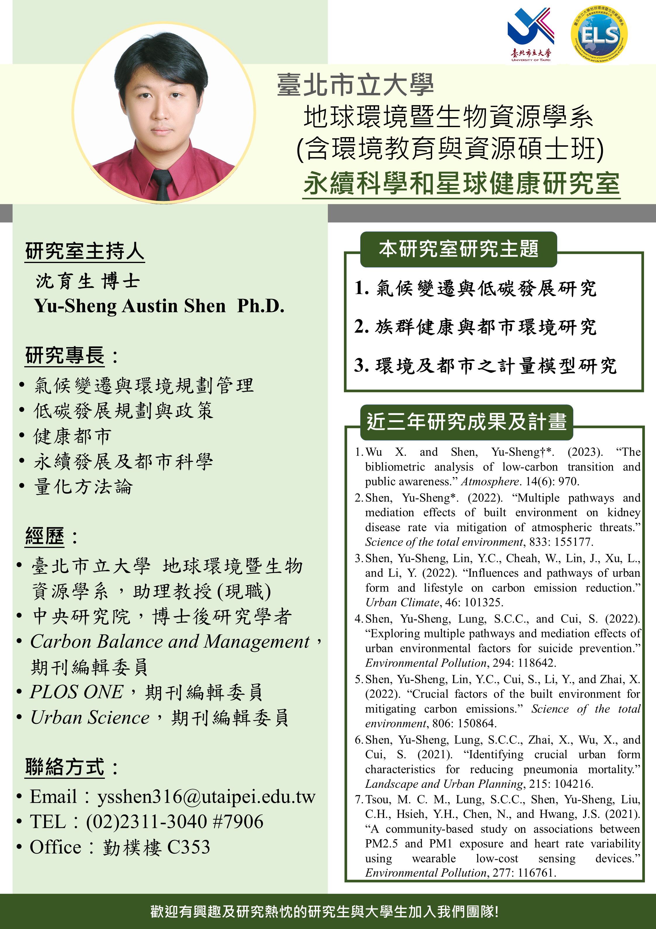 研究專長: 氣候變遷與環境規劃管理、低碳發展規劃與政策、健康都市、永續發展及都市科學、量化方法論 授課領域: 全球環境變遷、環境規劃與管理、環境教育政策與實務、書報討論 研究計畫及經歷:沈育生教師專頁 E-mail:ysshen316@utaipei.edu.tw 聯絡電話:(02)2311-3040分機7906 研究室:永續科學和星球健康研究室 |
