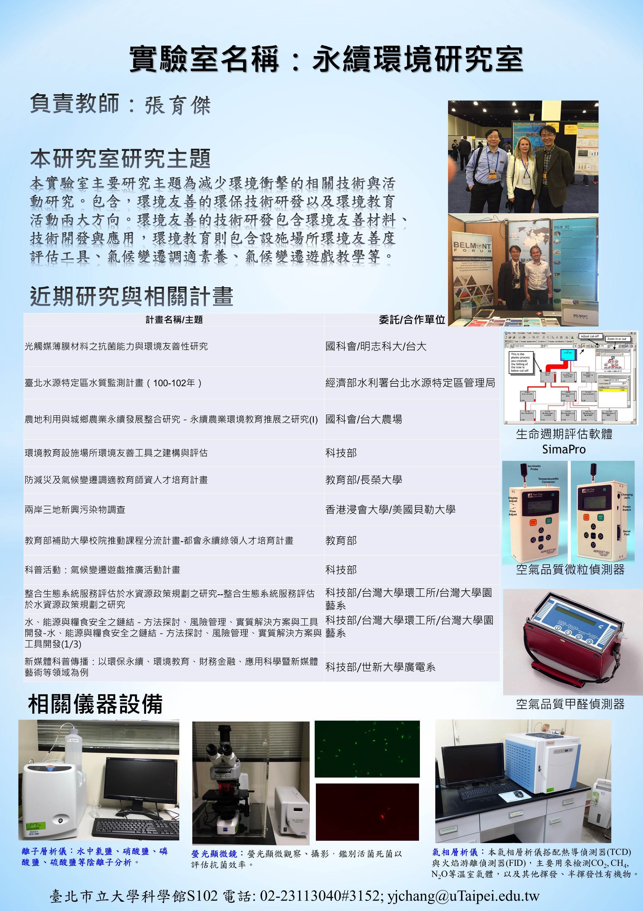 研究專長: 低碳生活、水環境教育、環境調查與分析、環境友善技術 授課領域: 環境化學特論、生物多樣性保育研究、城鄉生態學、環境時事剖析、環境問題概論、環境經營特論、綠建築研究、環境變遷與永續發展、微生物學(含實驗)、微生物資源與應用 研究計畫及經歷:張育傑教師專頁 E-mail:yjchang@utaipei.edu.tw 聯絡電話:(02)2311-3040分機3901 |