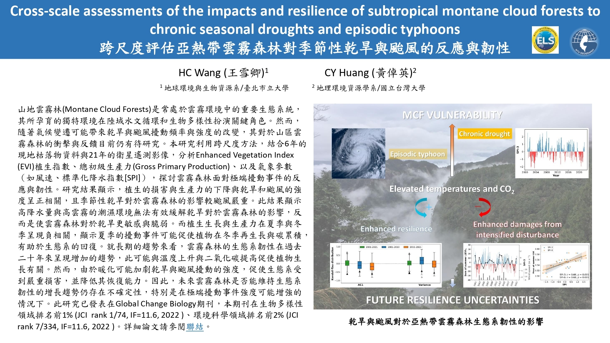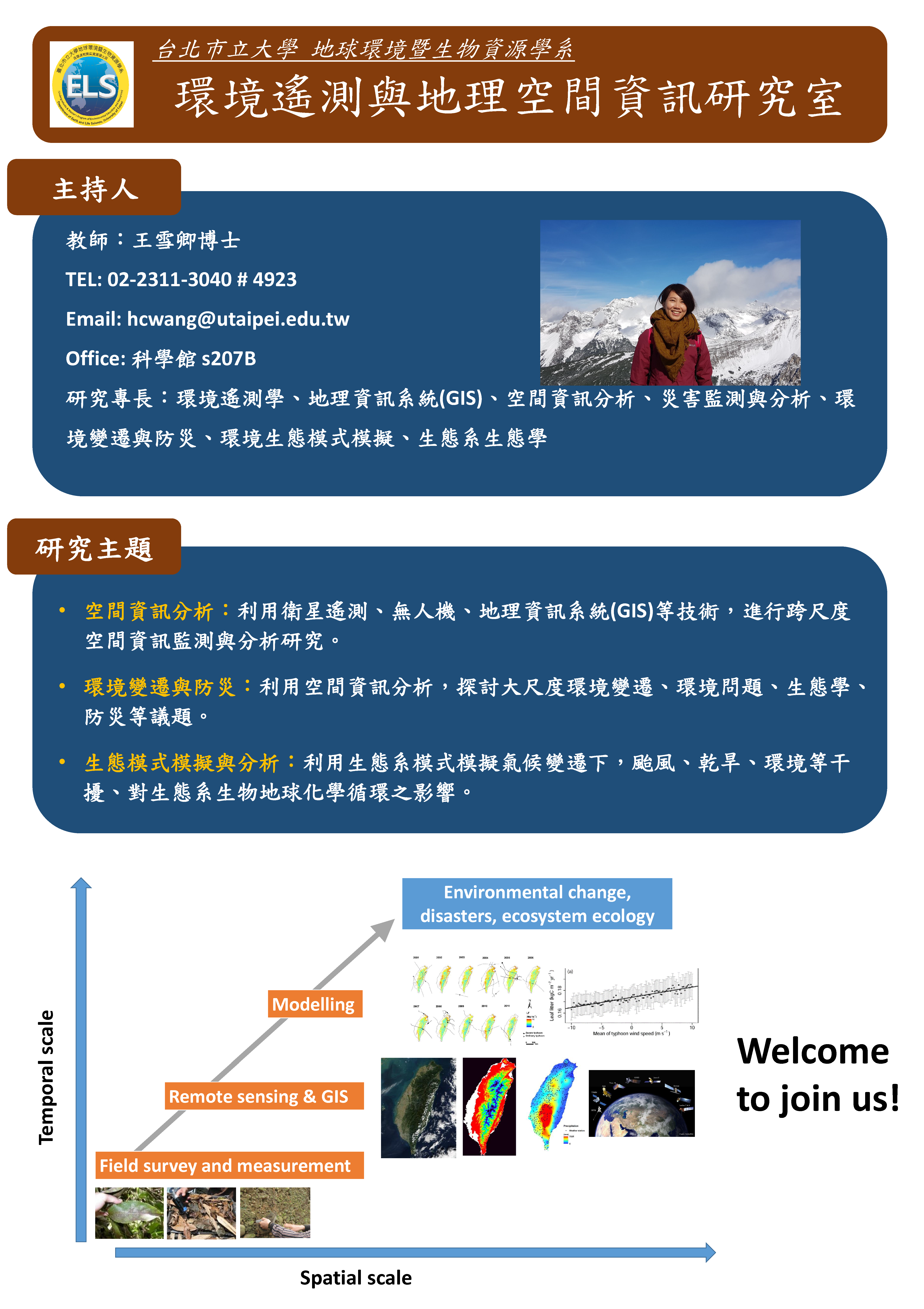 研究專長: 環境遙測學、地理資訊系統(GIS)、災害監測與分析、環境變遷與防災、環境生態模式模擬、生態系生態學 研究計畫及經歷:王雪卿教師專頁 E-mail:hcwang@go.utaipei.edu.tw 聯絡電話:(02)2311-3040分機3903 研究室:地理空間和遙測研究室 最新研究成果 : 跨尺度評估亞熱帶雲霧森林對季節性乾旱與颱風的反應與韌性 |