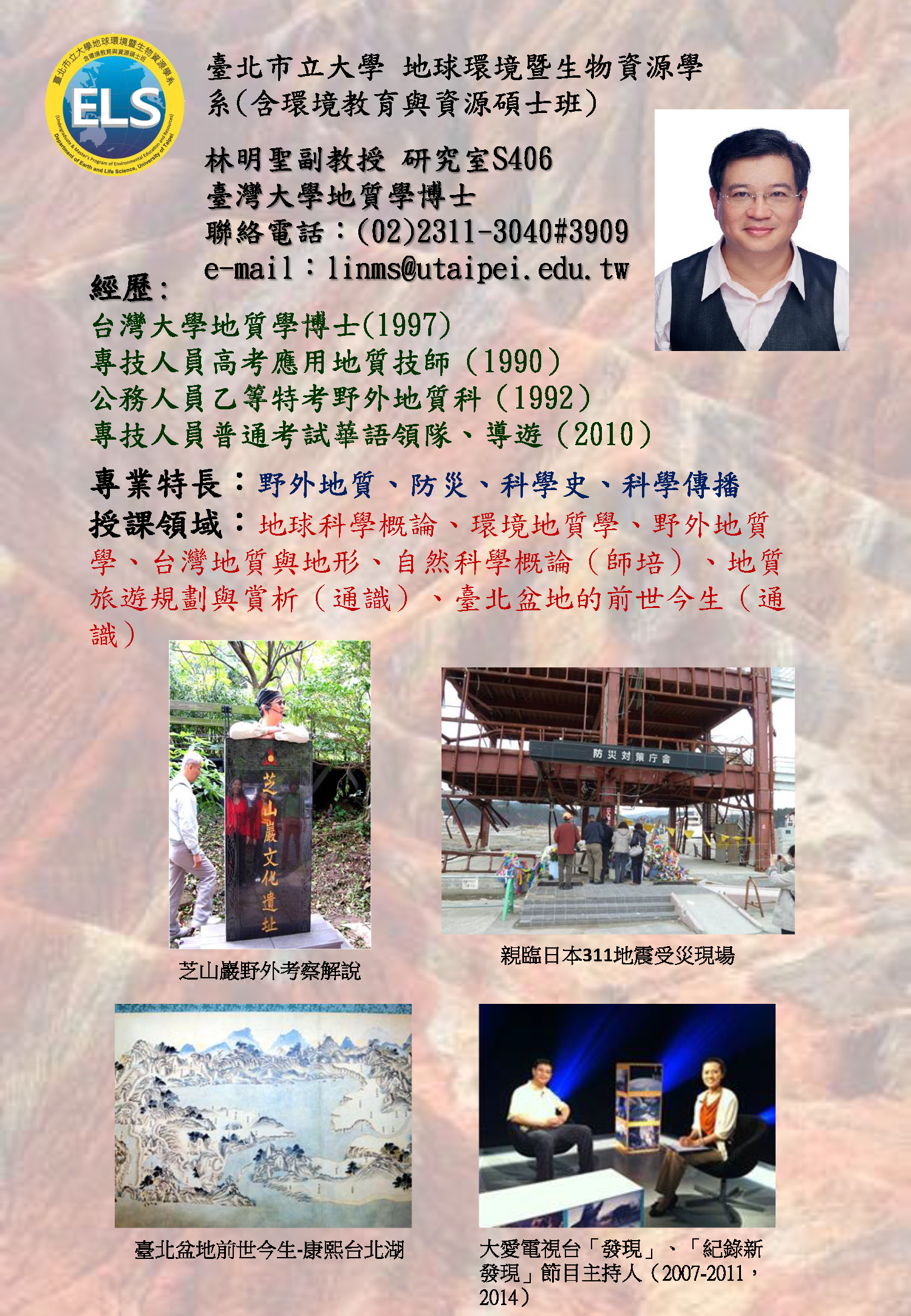 研究專長: 歷史地震、地質旅遊、防災教育、科學傳播 授課領域: 地球科學概論、環境地質學、野外地質學、台灣地質與地形、自然科學概論(師培)、地質旅遊規劃與賞析(通識)、臺北盆地的前世今生(通識) 研究計畫及經歷:林明聖教師專頁 E-mail:linms@utaipei.edu.tw 聯絡電話:(02)2311-3040分機3909 |